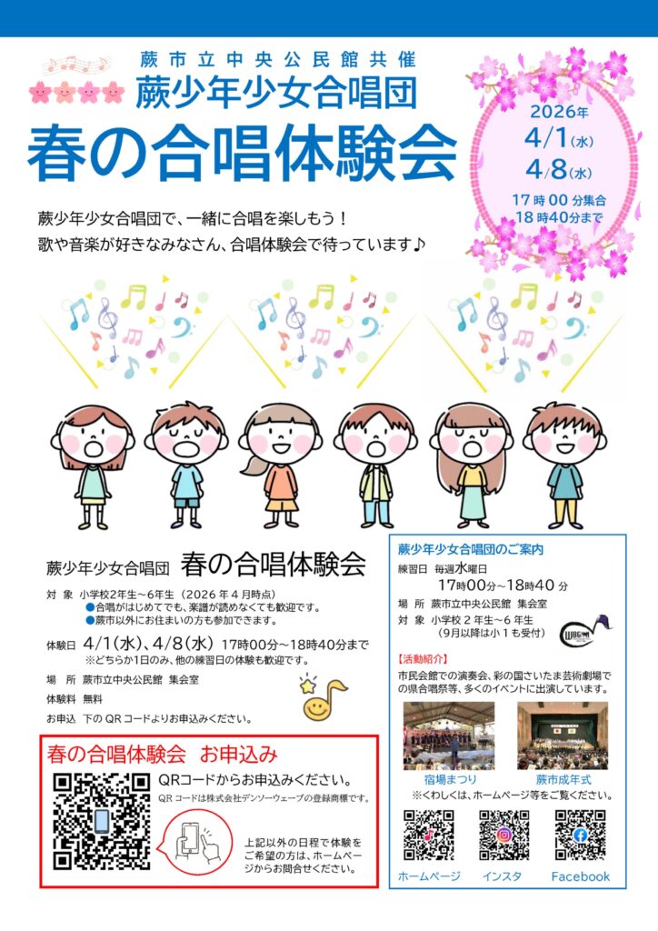 こんにちは! 桜の季節が近づき、子どもたちの新しいチャレンジを応援したくなる時期になりました。 蕨少年少女合唱団では、この春 合唱の楽しさを気軽に体験できる「春の合唱体験会」 を開催します。